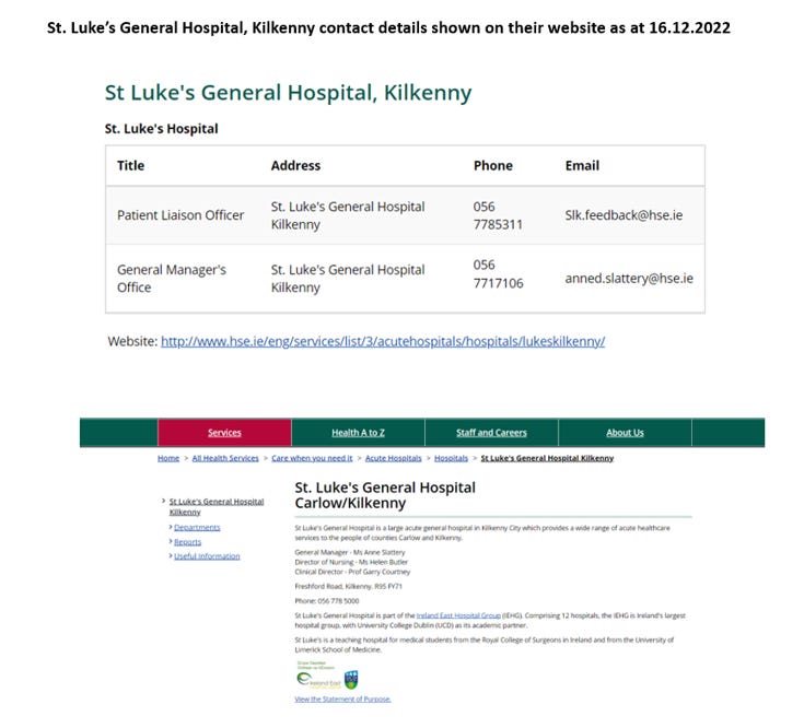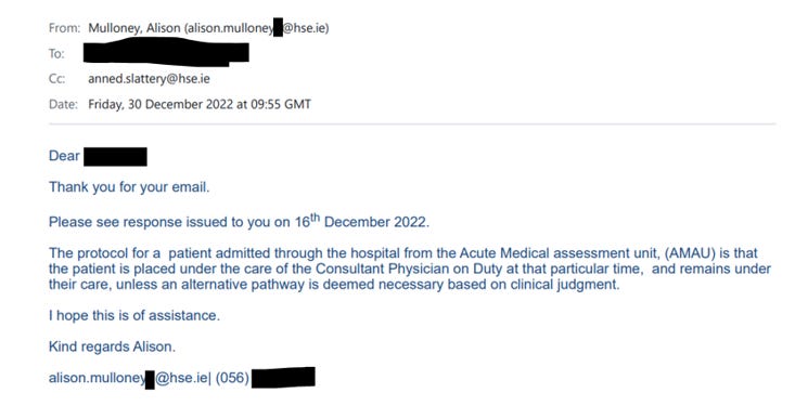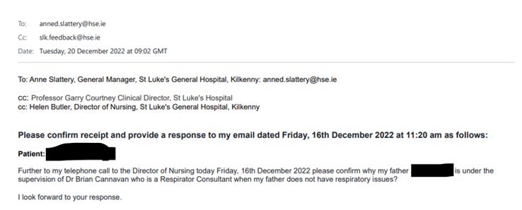 I was determined to get an answer to my important question and therefore, on 20th December 2022 I sent the following email to Ms Anne Slattery, General Manager, Professor Garry Courtney, Clinical Director and Ms Helen Butler, Director of Nursing: