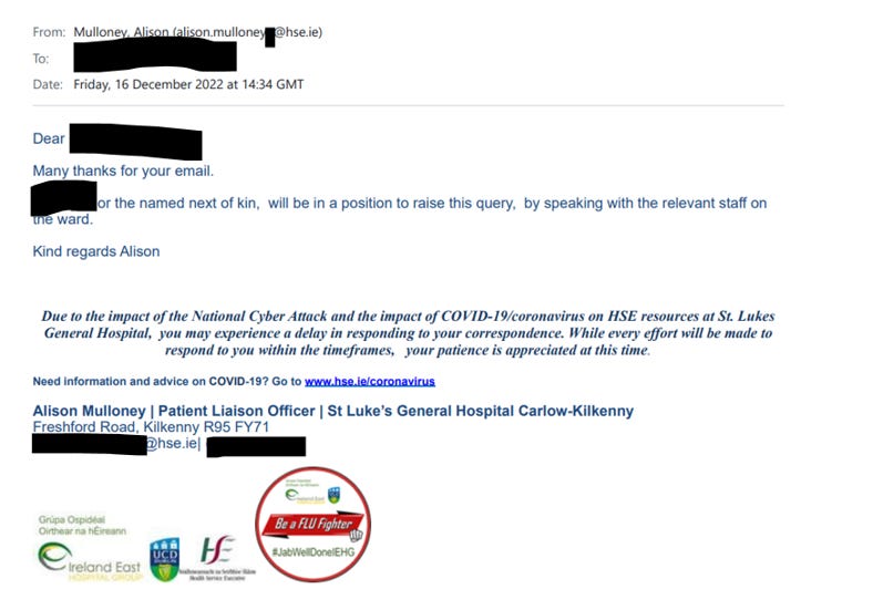 Following receipt of my email above dated 27th December 2022 and the copy of the legal notice as described, I received an email from Ms Alison Mulloney, Patient Liaison Officer dated 30th December 2022 where she referred me back to her email dated 16th December 2022 (above) and stated the following: