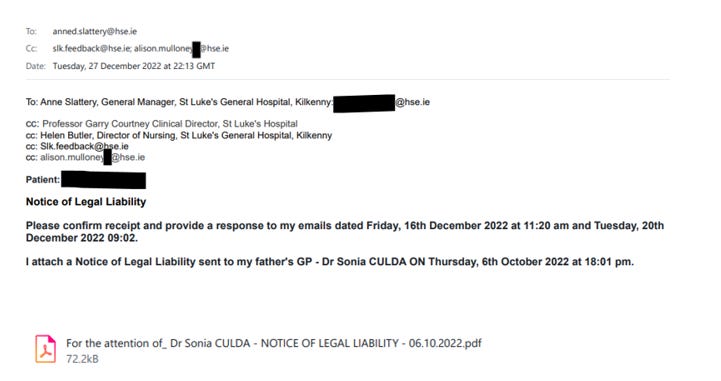 Therefore, on 27th December 2022 I sent the following email to Anne Slattery, General Manager, Professor Garry Courtney, Clinical Director, Ms Helen Butler, Director of Nursing and Ms Alison Mulloney, Patient Liaison Officer as I was terrified that the hospital medical staff would covertly inject my father with a Covid-19 booster and I wanted to make them aware that I had put our father’s GP Dr Sonia Culda on legal notice in order to prevent her from injecting our father for a third time with a dangerous substance – see my post titled: “The GP”;