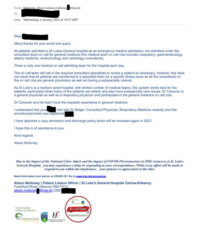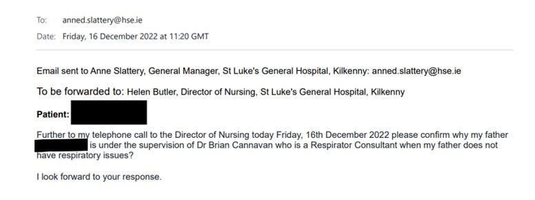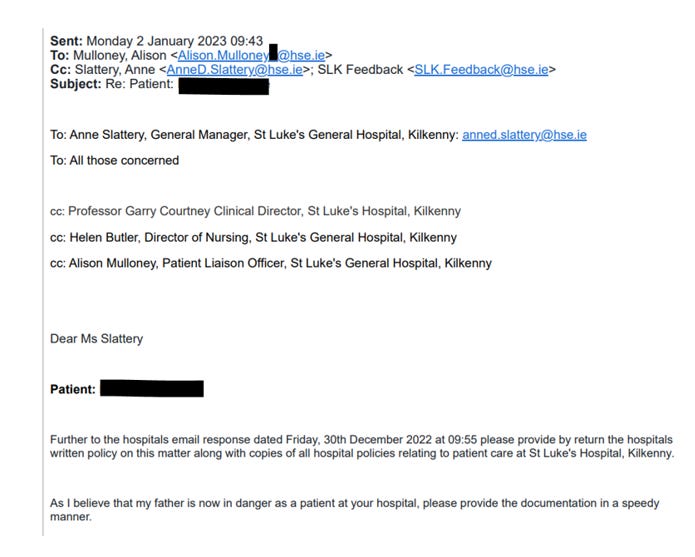 After my father’s second admission to the hospital by ambulance on 27th December 2022, I wrote once again by email on 2nd January 2023 to Ms Anne Slattery, General Manager, Professor Garry Courtney, Clinical Director, Ms Helen Butler, Director of Nursing, Ms Alison Mulloney, Patient Liaison Officer and All those concerned as I firmly believed my father was now in danger as a patient at St. Luke’s General Hospital, Kilkenny, and therefore, asked for the documentation to be provided to me in a speedy manner as follows:
