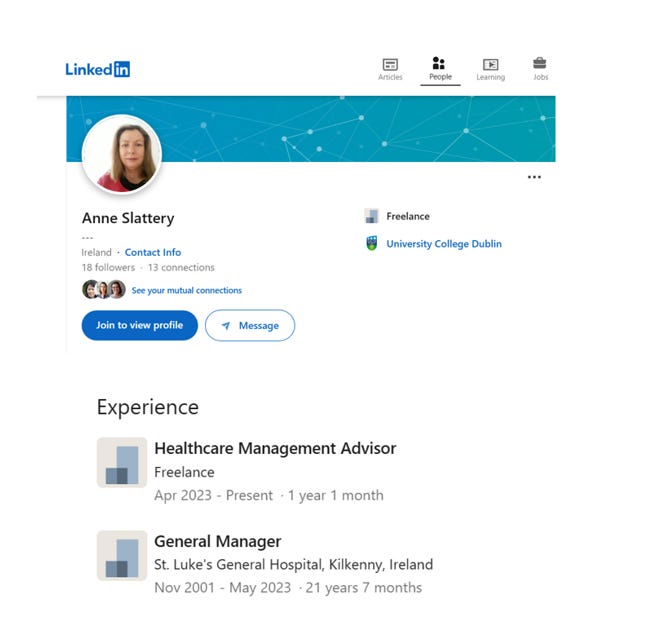 Ms Anne Slattery was the General Manager at the time of our father’s admission and death and at the time of the unannounced inspection by the HIQA. She left the employment of St. Luke’s General Hospital, Kilkenny in May 2023 just four months following our father’s death and the inspection, which I do not believe to be a coincidence and in my opinion, this is strongly correlated. She now appears to be a freelance Healthcare Management Advisor. This detail is clearly visible on Ms Anne Slattery’s public LinkedIn page as at 25.04.2024: